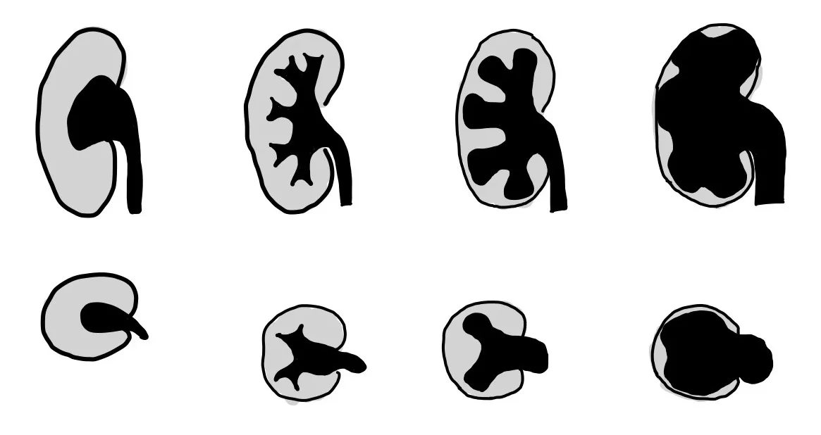 - 4°: Hydronephrotische Sackniere, Parenchym vollständig verdrängt - tritt nur chronisch auf